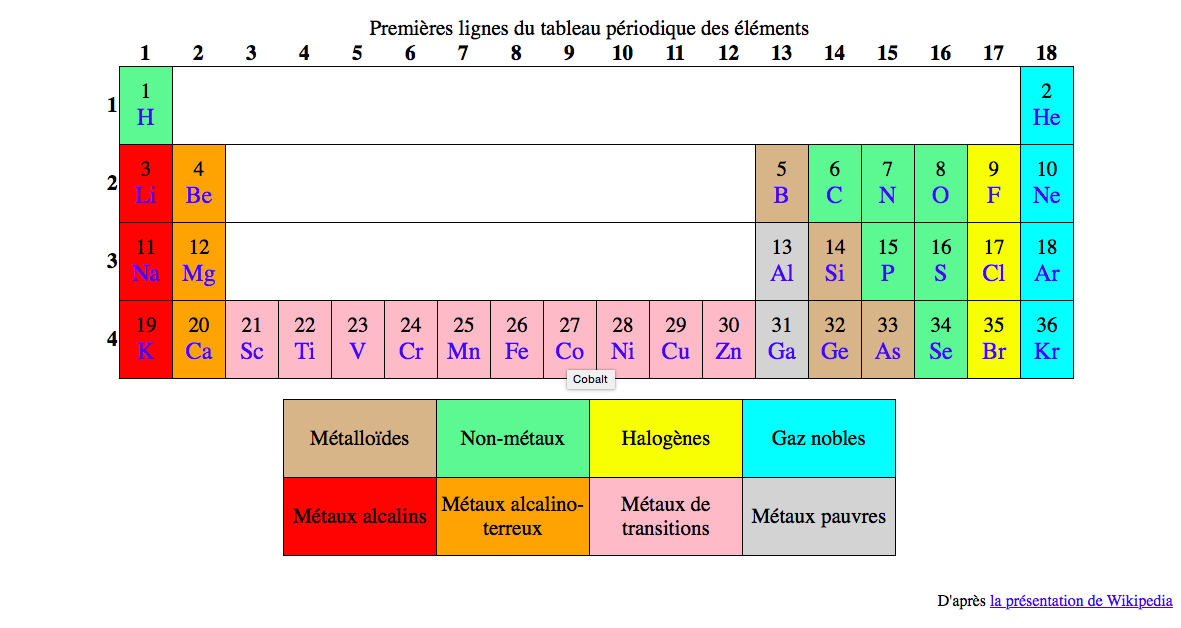 Reproduire les premières lignes du tableau périodique des éléments similaire à la présentation de Wikipedia.